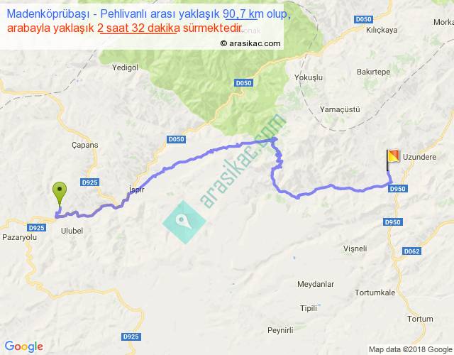 Madenköprübaşı - Pehlivanlı arası yaklaşık olarak 90 km/h ile yukarıda belirtilen sürede olup, iki yerin kuş uçuşu uzaklığı (mesafesi) 54'dir. Yolculuk otobüsle 3 saat 17 dakika sürmektedir.