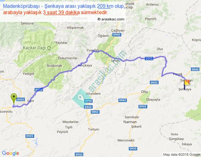 Madenköprübaşı - Şenkaya arası yaklaşık olarak 90 km/h ile yukarıda belirtilen sürede olup, iki yerin kuş uçuşu uzaklığı (mesafesi) 126'dir. Yolculuk otobüsle 4 saat 44 dakika sürmektedir.