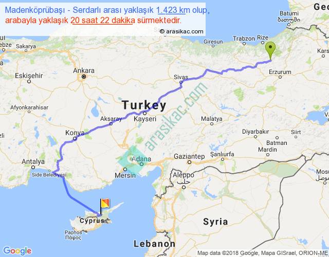 Madenköprübaşı - Serdarlı arası yaklaşık olarak 90 km/h ile yukarıda belirtilen sürede olup, iki yerin kuş uçuşu uzaklığı (mesafesi) 854'dir. Eğer belirtilen yerler arasında uçak seferi var ise bu süre uçakla 1 saat 18 dakika'ya kadar düşebilir. Yolculuk otobüsle 1 gün 2 saat sürmektedir.