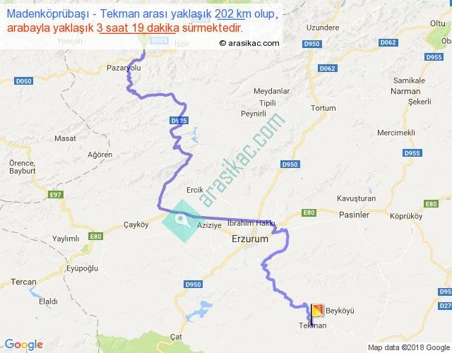 Madenköprübaşı - Tekman arası yaklaşık olarak 90 km/h ile yukarıda belirtilen sürede olup, iki yerin kuş uçuşu uzaklığı (mesafesi) 106'dir. Yolculuk otobüsle 4 saat 18 dakika sürmektedir.