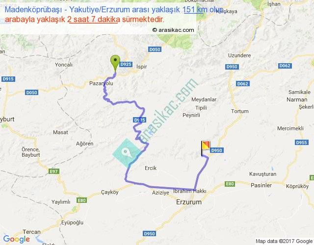 Madenköprübaşı - Yakutiye Erzurum arası yaklaşık olarak 90 km/h ile yukarıda belirtilen sürede olup, iki yerin kuş uçuşu uzaklığı (mesafesi) 57'dir. Yolculuk otobüsle 2 saat 45 dakika sürmektedir.