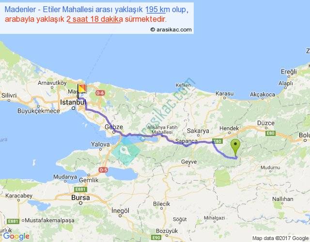 Madenler - Etiler Mahallesi arası yaklaşık olarak 90 km/h ile yukarıda belirtilen sürede olup, iki yerin kuş uçuşu uzaklığı (mesafesi) 159'dir. Yolculuk otobüsle 2 saat 59 dakika sürmektedir.