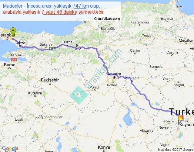 Madenler - İncesu arası yaklaşık olarak 90 km/h ile yukarıda belirtilen sürede olup, iki yerin kuş uçuşu uzaklığı (mesafesi) 573'dir. Eğer belirtilen yerler arasında uçak seferi var ise bu süre uçakla 52 dakika'ya kadar düşebilir. Yolculuk otobüsle 10 saat 5 dakika sürmektedir.
