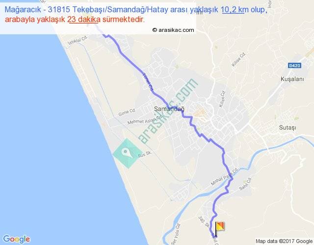 Mağaracık - 31815 Tekebaşı Samandağ Hatay arası yaklaşık olarak 90 km/h ile yukarıda belirtilen sürede olup, iki yerin kuş uçuşu uzaklığı (mesafesi) 8'dir. Yolculuk otobüsle 29 dakika sürmektedir.
