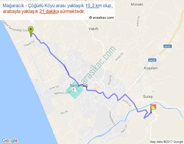 Mağaracık - Çöğürlü Köyü arası yaklaşık olarak 90 km/h ile yukarıda belirtilen sürede olup, iki yerin kuş uçuşu uzaklığı (mesafesi) 8'dir. Yolculuk otobüsle 27 dakika sürmektedir.