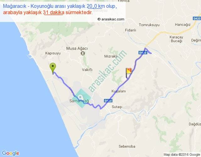 Mağaracık - Koyunoğlu arası yaklaşık olarak 90 km/h ile yukarıda belirtilen sürede olup, iki yerin kuş uçuşu uzaklığı (mesafesi) 7'dir. Yolculuk otobüsle 40 dakika sürmektedir.