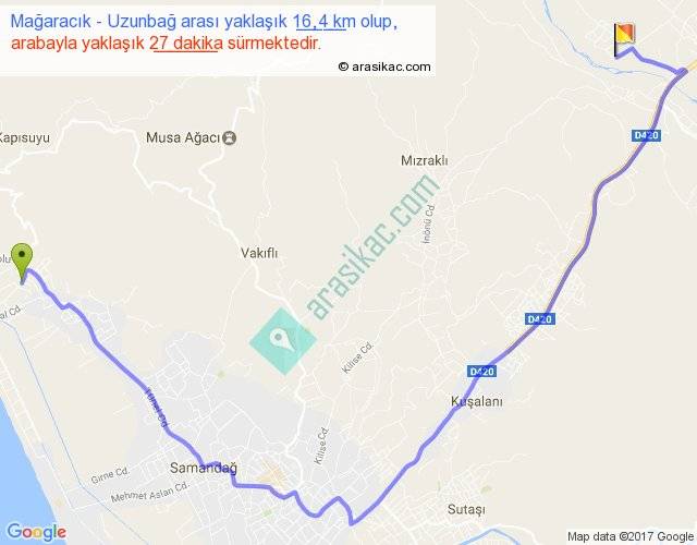 Mağaracık - Uzunbağ arası yaklaşık olarak 90 km/h ile yukarıda belirtilen sürede olup, iki yerin kuş uçuşu uzaklığı (mesafesi) 9'dir. Yolculuk otobüsle 35 dakika sürmektedir.