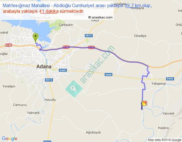Mahfesığmaz Mahallesi - Abdioğlu Cumhuriyet arası yaklaşık olarak 90 km/h ile yukarıda belirtilen sürede olup, iki yerin kuş uçuşu uzaklığı (mesafesi) 27'dir. Yolculuk otobüsle 53 dakika sürmektedir.