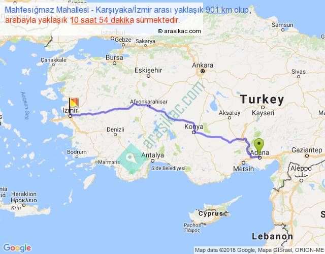 Mahfesığmaz Mahallesi - Karşıyaka İzmir arası yaklaşık olarak 90 km/h ile yukarıda belirtilen sürede olup, iki yerin kuş uçuşu uzaklığı (mesafesi) 732'dir. Eğer belirtilen yerler arasında uçak seferi var ise bu süre uçakla 1 saat 07 dakika'ya kadar düşebilir. Yolculuk otobüsle 14 saat 10 dakika sürmektedir.