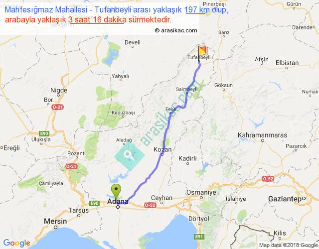 Mahfesığmaz Mahallesi - Tufanbeyli arası yaklaşık olarak 90 km/h ile yukarıda belirtilen sürede olup, iki yerin kuş uçuşu uzaklığı (mesafesi) 157'dir. Yolculuk otobüsle 4 saat 14 dakika sürmektedir.