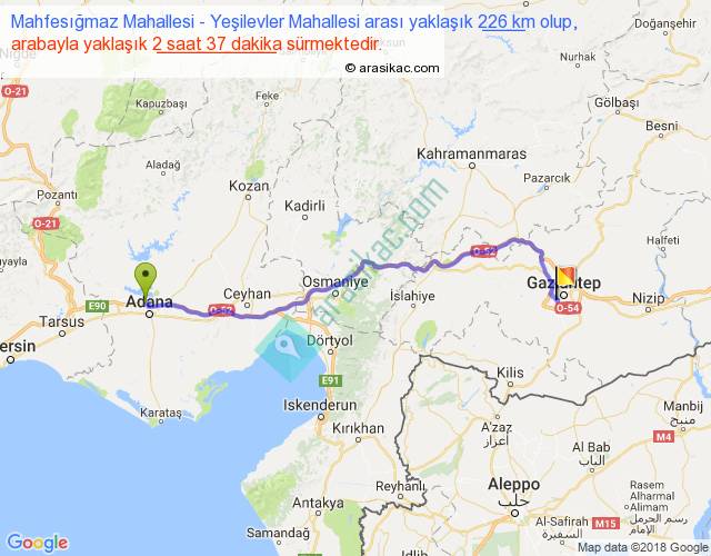 Mahfesığmaz Mahallesi - Yeşilevler Mahallesi arası yaklaşık olarak 90 km/h ile yukarıda belirtilen sürede olup, iki yerin kuş uçuşu uzaklığı (mesafesi) 180'dir. Yolculuk otobüsle 3 saat 24 dakika sürmektedir.