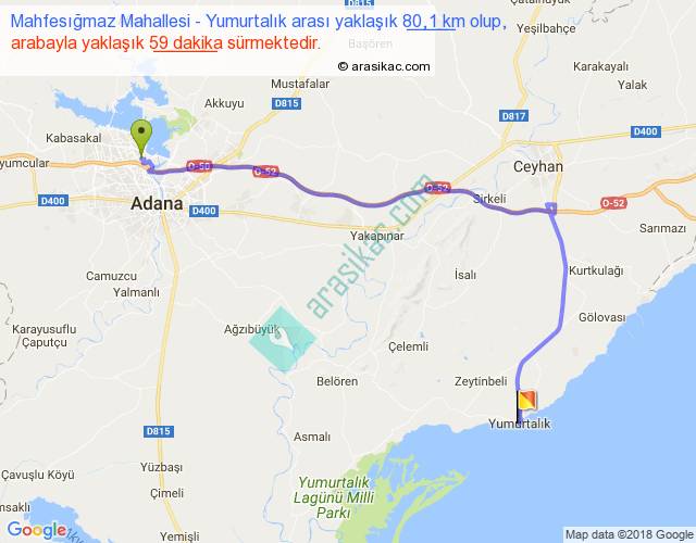 Mahfesığmaz Mahallesi - Yumurtalık arası yaklaşık olarak 90 km/h ile yukarıda belirtilen sürede olup, iki yerin kuş uçuşu uzaklığı (mesafesi) 52'dir. Yolculuk otobüsle 1 saat 16 dakika sürmektedir.