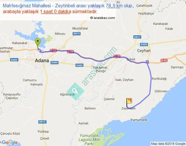 Mahfesığmaz Mahallesi - Zeytinbeli arası yaklaşık olarak 90 km/h ile yukarıda belirtilen sürede olup, iki yerin kuş uçuşu uzaklığı (mesafesi) 45'dir. Yolculuk otobüsle 1 saat 18 dakika sürmektedir.