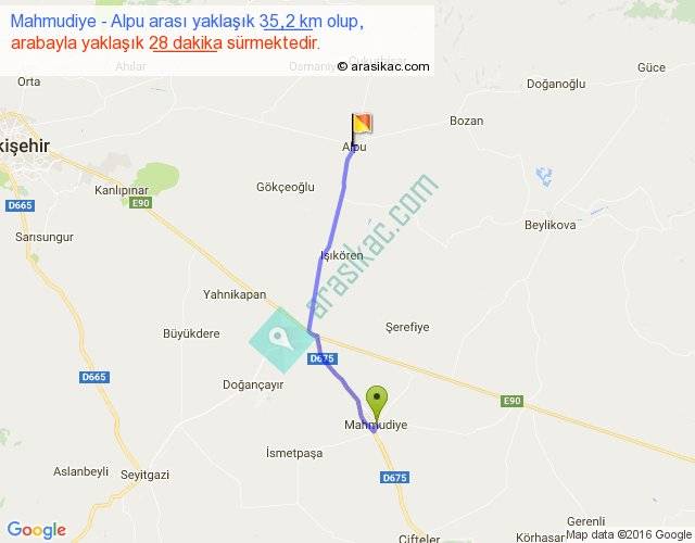 Mahmudiye - Alpu arası yaklaşık olarak 90 km/h ile yukarıda belirtilen sürede olup, iki yerin kuş uçuşu uzaklığı (mesafesi) 30'dir. Yolculuk otobüsle 36 dakika sürmektedir.