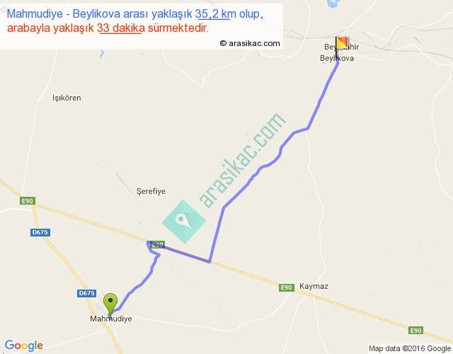 Mahmudiye - Beylikova arası yaklaşık olarak 90 km/h ile yukarıda belirtilen sürede olup, iki yerin kuş uçuşu uzaklığı (mesafesi) 29'dir. Yolculuk otobüsle 41 dakika sürmektedir.