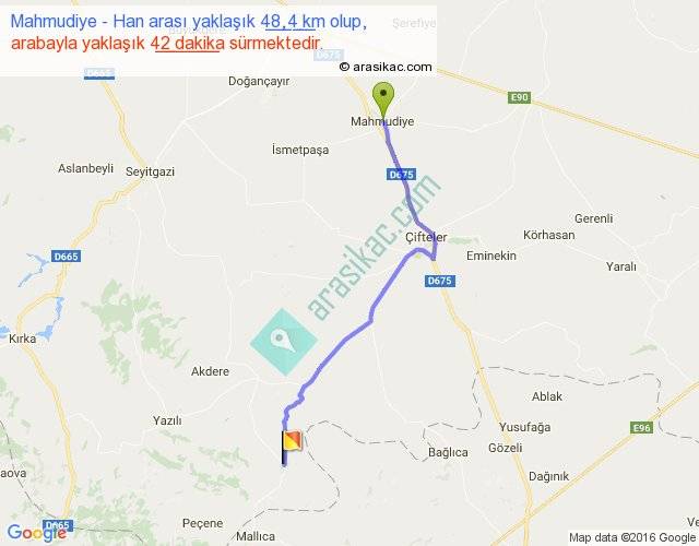 Mahmudiye - Han arası yaklaşık olarak 90 km/h ile yukarıda belirtilen sürede olup, iki yerin kuş uçuşu uzaklığı (mesafesi) 38'dir. Yolculuk otobüsle 54 dakika sürmektedir.