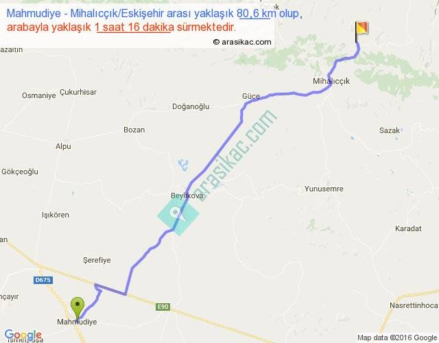 Mahmudiye - Mihalıcçık Eskişehir arası yaklaşık olarak 90 km/h ile yukarıda belirtilen sürede olup, iki yerin kuş uçuşu uzaklığı (mesafesi) 67'dir. Yolculuk otobüsle 1 saat 37 dakika sürmektedir.