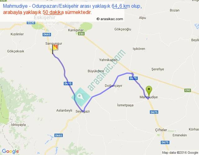 Mahmudiye - Odunpazarı Eskişehir arası yaklaşık olarak 90 km/h ile yukarıda belirtilen sürede olup, iki yerin kuş uçuşu uzaklığı (mesafesi) 40'dir. Yolculuk otobüsle 1 saat 5 dakika sürmektedir.