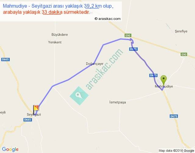 Mahmudiye - Seyitgazi arası yaklaşık olarak 90 km/h ile yukarıda belirtilen sürede olup, iki yerin kuş uçuşu uzaklığı (mesafesi) 26'dir. Yolculuk otobüsle 42 dakika sürmektedir.