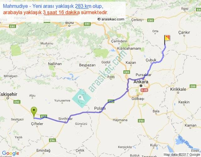 Mahmudiye - Yeni arası yaklaşık olarak 90 km/h ile yukarıda belirtilen sürede olup, iki yerin kuş uçuşu uzaklığı (mesafesi) 223'dir. Yolculuk otobüsle 4 saat 14 dakika sürmektedir.