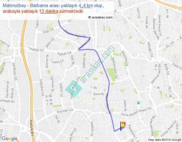 Mahmutbey - Barbaros arası yaklaşık olarak 90 km/h ile yukarıda belirtilen sürede olup, iki yerin kuş uçuşu uzaklığı (mesafesi) 3'dir. Yolculuk otobüsle 16 dakika sürmektedir.