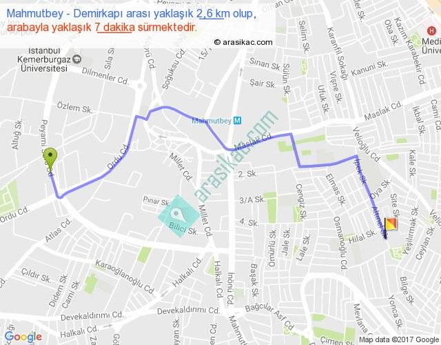 Mahmutbey - Demirkapı arası yaklaşık olarak 90 km/h ile yukarıda belirtilen sürede olup, iki yerin kuş uçuşu uzaklığı (mesafesi) 2'dir. Yolculuk otobüsle 9 dakika sürmektedir.
