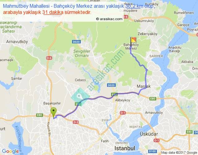 Mahmutbey Mahallesi - Bahçeköy Merkez arası yaklaşık olarak 90 km/h ile yukarıda belirtilen sürede olup, iki yerin kuş uçuşu uzaklığı (mesafesi) 20'dir. Yolculuk otobüsle 40 dakika sürmektedir.
