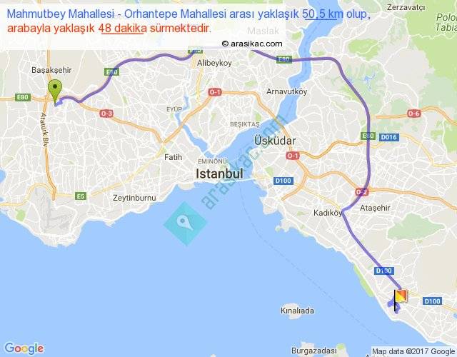 Mahmutbey Mahallesi - Orhantepe Mahallesi arası yaklaşık olarak 90 km/h ile yukarıda belirtilen sürede olup, iki yerin kuş uçuşu uzaklığı (mesafesi) 32'dir. Yolculuk otobüsle 1 saat 2 dakika sürmektedir.