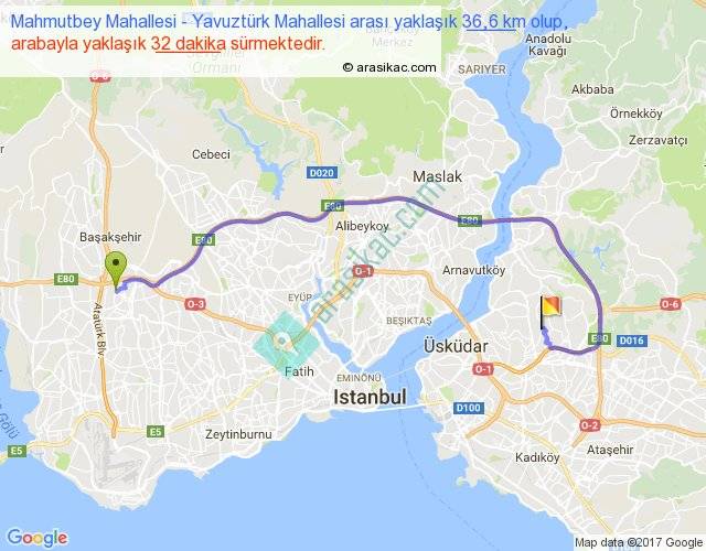 Mahmutbey Mahallesi - Yavuztürk Mahallesi arası yaklaşık olarak 90 km/h ile yukarıda belirtilen sürede olup, iki yerin kuş uçuşu uzaklığı (mesafesi) 22'dir. Yolculuk otobüsle 41 dakika sürmektedir.