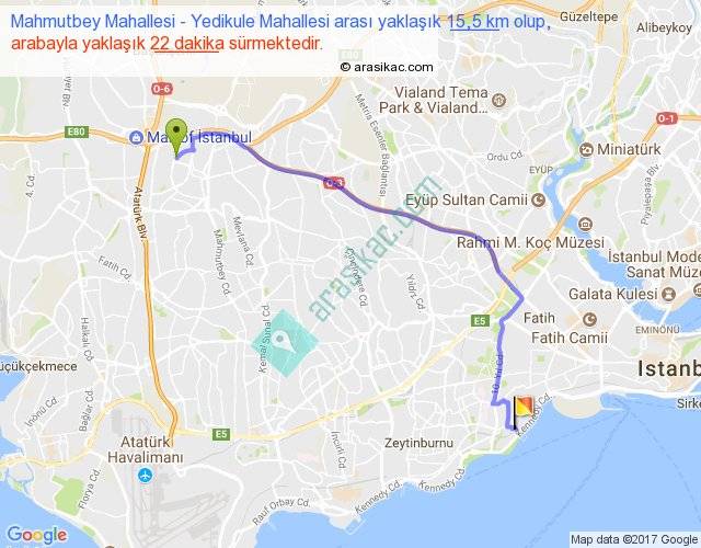 Mahmutbey Mahallesi - Yedikule Mahallesi arası yaklaşık olarak 90 km/h ile yukarıda belirtilen sürede olup, iki yerin kuş uçuşu uzaklığı (mesafesi) 11'dir. Yolculuk otobüsle 28 dakika sürmektedir.