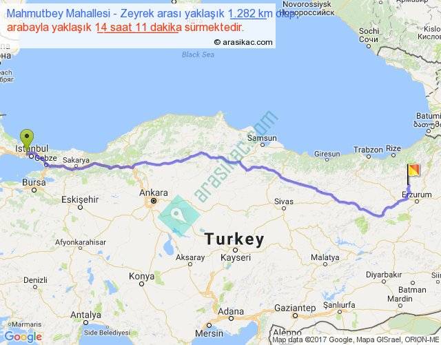 Mahmutbey Mahallesi - Zeyrek arası yaklaşık olarak 90 km/h ile yukarıda belirtilen sürede olup, iki yerin kuş uçuşu uzaklığı (mesafesi) 1023'dir. Eğer belirtilen yerler arasında uçak seferi var ise bu süre uçakla 1 saat 34 dakika'ya kadar düşebilir. Yolculuk otobüsle 18 saat 26 dakika sürmektedir.