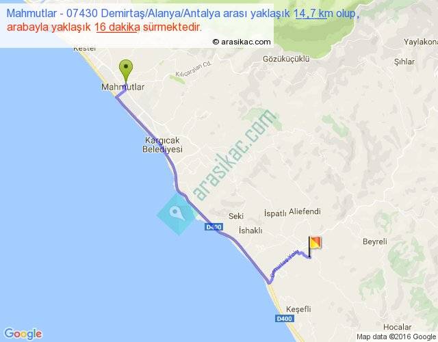Mahmutlar - 07430 Demirtaş Alanya Antalya arası yaklaşık olarak 90 km/h ile yukarıda belirtilen sürede olup, iki yerin kuş uçuşu uzaklığı (mesafesi) 11'dir. Yolculuk otobüsle 20 dakika sürmektedir.