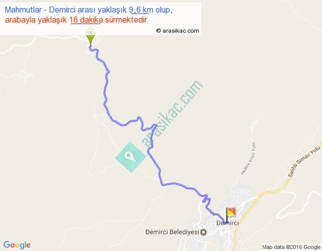 Mahmutlar - Demirci arası yaklaşık olarak 90 km/h ile yukarıda belirtilen sürede olup, iki yerin kuş uçuşu uzaklığı (mesafesi) 7'dir. Yolculuk otobüsle 20 dakika sürmektedir.