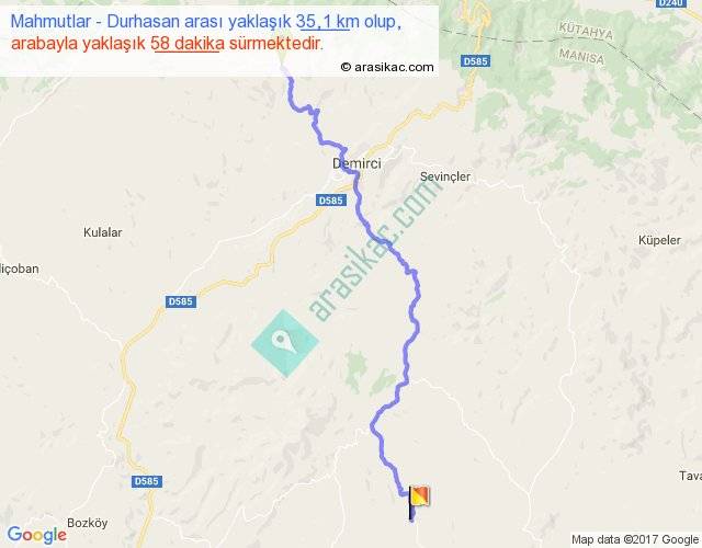 Mahmutlar - Durhasan arası yaklaşık olarak 90 km/h ile yukarıda belirtilen sürede olup, iki yerin kuş uçuşu uzaklığı (mesafesi) 25'dir. Yolculuk otobüsle 1 saat 15 dakika sürmektedir.
