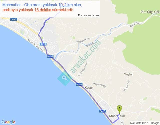 Mahmutlar - Oba arası yaklaşık olarak 90 km/h ile yukarıda belirtilen sürede olup, iki yerin kuş uçuşu uzaklığı (mesafesi) 7'dir. Yolculuk otobüsle 20 dakika sürmektedir.