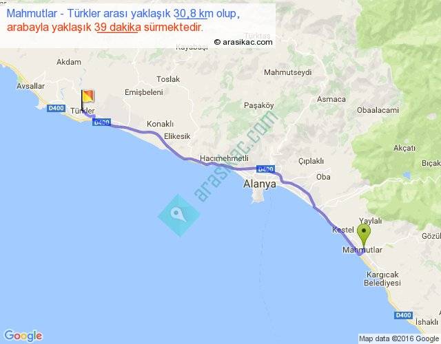 Mahmutlar - Türkler arası yaklaşık olarak 90 km/h ile yukarıda belirtilen sürede olup, iki yerin kuş uçuşu uzaklığı (mesafesi) 28'dir. Yolculuk otobüsle 50 dakika sürmektedir.