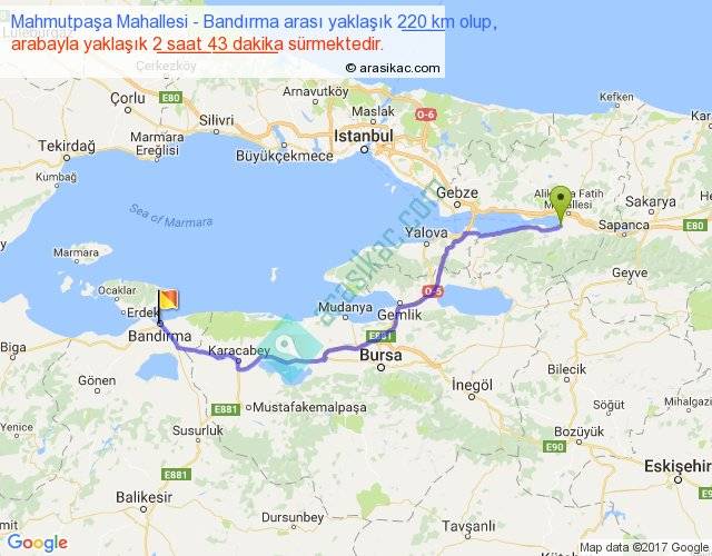 Mahmutpaşa Mahallesi - Bandırma arası yaklaşık olarak 90 km/h ile yukarıda belirtilen sürede olup, iki yerin kuş uçuşu uzaklığı (mesafesi) 171'dir. Yolculuk otobüsle 3 saat 31 dakika sürmektedir.
