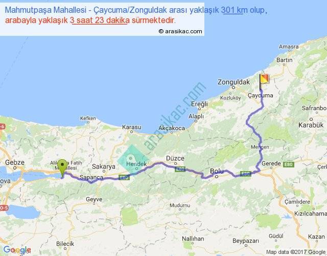 Mahmutpaşa Mahallesi - Çaycuma Zonguldak arası yaklaşık olarak 90 km/h ile yukarıda belirtilen sürede olup, iki yerin kuş uçuşu uzaklığı (mesafesi) 194'dir. Yolculuk otobüsle 4 saat 23 dakika sürmektedir.