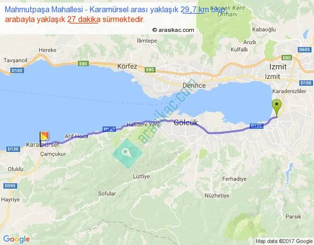 Mahmutpaşa Mahallesi - Karamürsel arası yaklaşık olarak 90 km/h ile yukarıda belirtilen sürede olup, iki yerin kuş uçuşu uzaklığı (mesafesi) 28'dir. Yolculuk otobüsle 35 dakika sürmektedir.