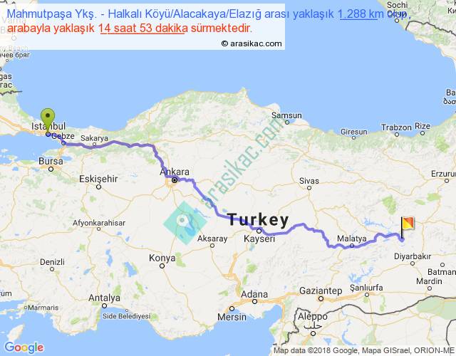 Mahmutpaşa Ykş. - Halkalı Köyü Alacakaya Elazığ arası yaklaşık olarak 90 km/h ile yukarıda belirtilen sürede olup, iki yerin kuş uçuşu uzaklığı (mesafesi) 968'dir. Eğer belirtilen yerler arasında uçak seferi var ise bu süre uçakla 1 saat 29 dakika'ya kadar düşebilir. Yolculuk otobüsle 19 saat 20 dakika sürmektedir.