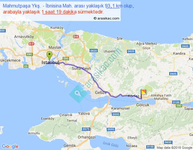 Mahmutpaşa Ykş. - İbnisina Mah. arası yaklaşık olarak 90 km/h ile yukarıda belirtilen sürede olup, iki yerin kuş uçuşu uzaklığı (mesafesi) 75'dir. Yolculuk otobüsle 1 saat 42 dakika sürmektedir.