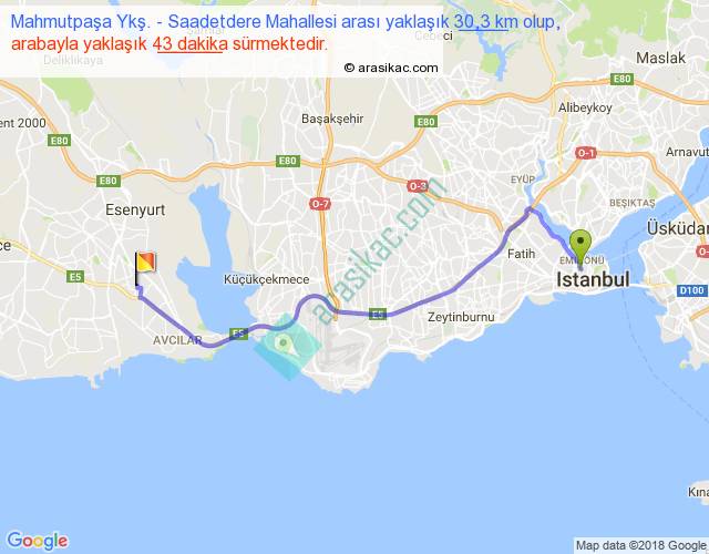 Mahmutpaşa Ykş. - Saadetdere Mahallesi arası yaklaşık olarak 90 km/h ile yukarıda belirtilen sürede olup, iki yerin kuş uçuşu uzaklığı (mesafesi) 23'dir. Yolculuk otobüsle 55 dakika sürmektedir.