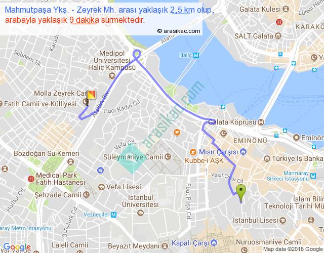 Mahmutpaşa Ykş. - Zeyrek Mh. arası yaklaşık olarak 90 km/h ile yukarıda belirtilen sürede olup, iki yerin kuş uçuşu uzaklığı (mesafesi) 1'dir. Yolculuk otobüsle 11 dakika sürmektedir.