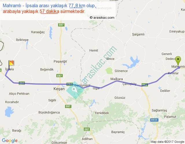 Mahramlı - İpsala arası yaklaşık olarak 90 km/h ile yukarıda belirtilen sürede olup, iki yerin kuş uçuşu uzaklığı (mesafesi) 67'dir. Yolculuk otobüsle 1 saat 14 dakika sürmektedir.