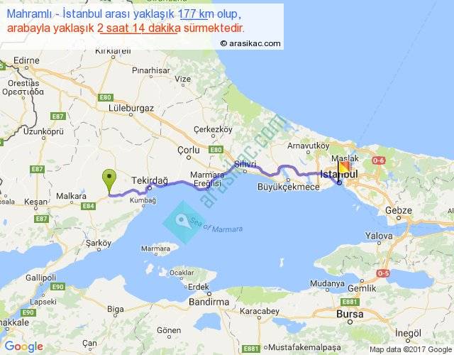 Mahramlı - İstanbul arası yaklaşık olarak 90 km/h ile yukarıda belirtilen sürede olup, iki yerin kuş uçuşu uzaklığı (mesafesi) 149'dir. Yolculuk otobüsle 2 saat 54 dakika sürmektedir.