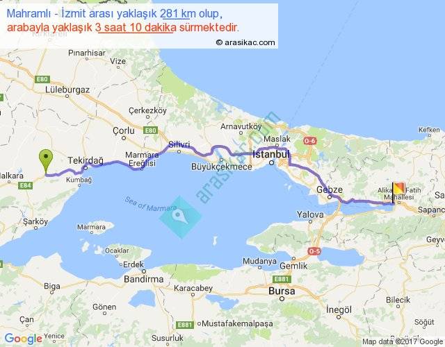 Mahramlı - İzmit arası yaklaşık olarak 90 km/h ile yukarıda belirtilen sürede olup, iki yerin kuş uçuşu uzaklığı (mesafesi) 230'dir. Yolculuk otobüsle 4 saat 7 dakika sürmektedir.