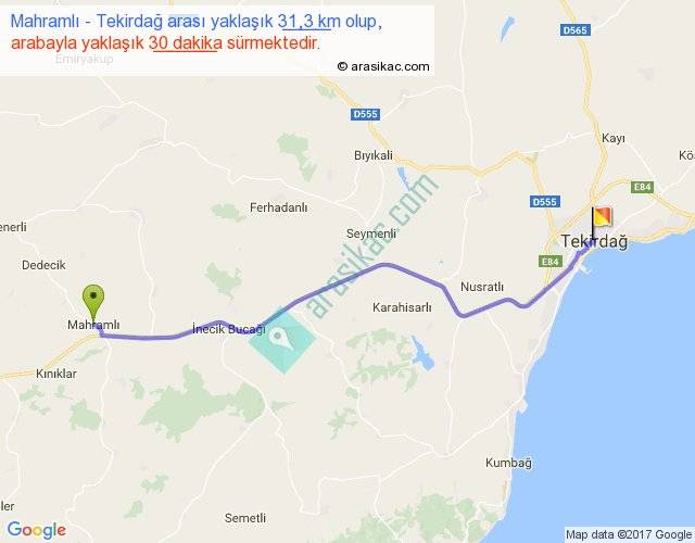 Mahramlı - Tekirdağ arası yaklaşık olarak 90 km/h ile yukarıda belirtilen sürede olup, iki yerin kuş uçuşu uzaklığı (mesafesi) 27'dir. Yolculuk otobüsle 39 dakika sürmektedir.