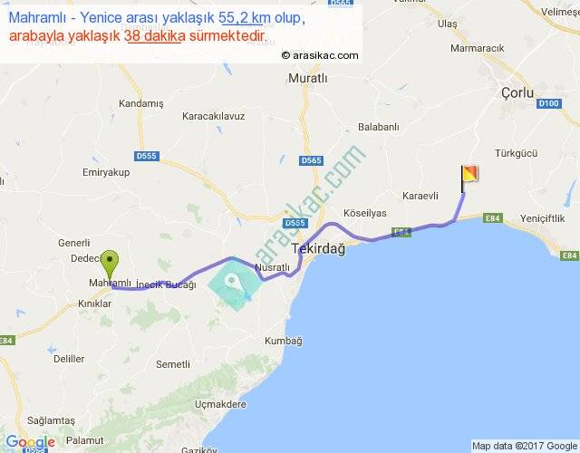 Mahramlı - Yenice arası yaklaşık olarak 90 km/h ile yukarıda belirtilen sürede olup, iki yerin kuş uçuşu uzaklığı (mesafesi) 46'dir. Yolculuk otobüsle 49 dakika sürmektedir.