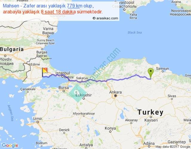 Mahsen - Zafer arası yaklaşık olarak 90 km/h ile yukarıda belirtilen sürede olup, iki yerin kuş uçuşu uzaklığı (mesafesi) 663'dir. Eğer belirtilen yerler arasında uçak seferi var ise bu süre uçakla 1 saat 01 dakika'ya kadar düşebilir. Yolculuk otobüsle 10 saat 47 dakika sürmektedir.