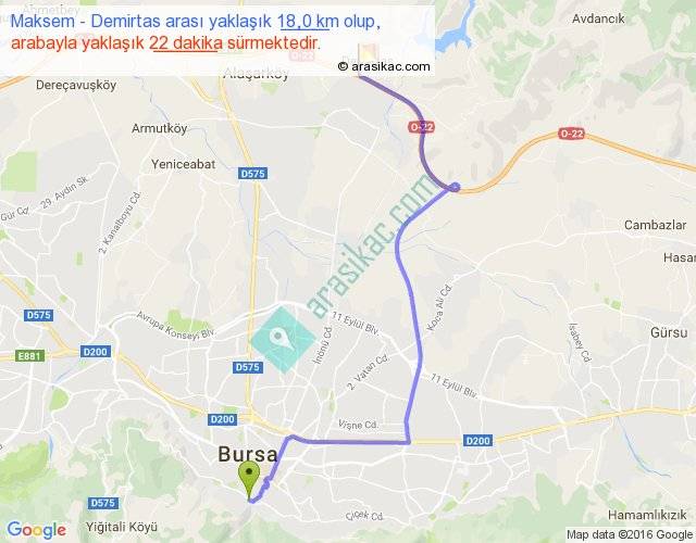 Maksem - Demirtas arası yaklaşık olarak 90 km/h ile yukarıda belirtilen sürede olup, iki yerin kuş uçuşu uzaklığı (mesafesi) 12'dir. Yolculuk otobüsle 28 dakika sürmektedir.